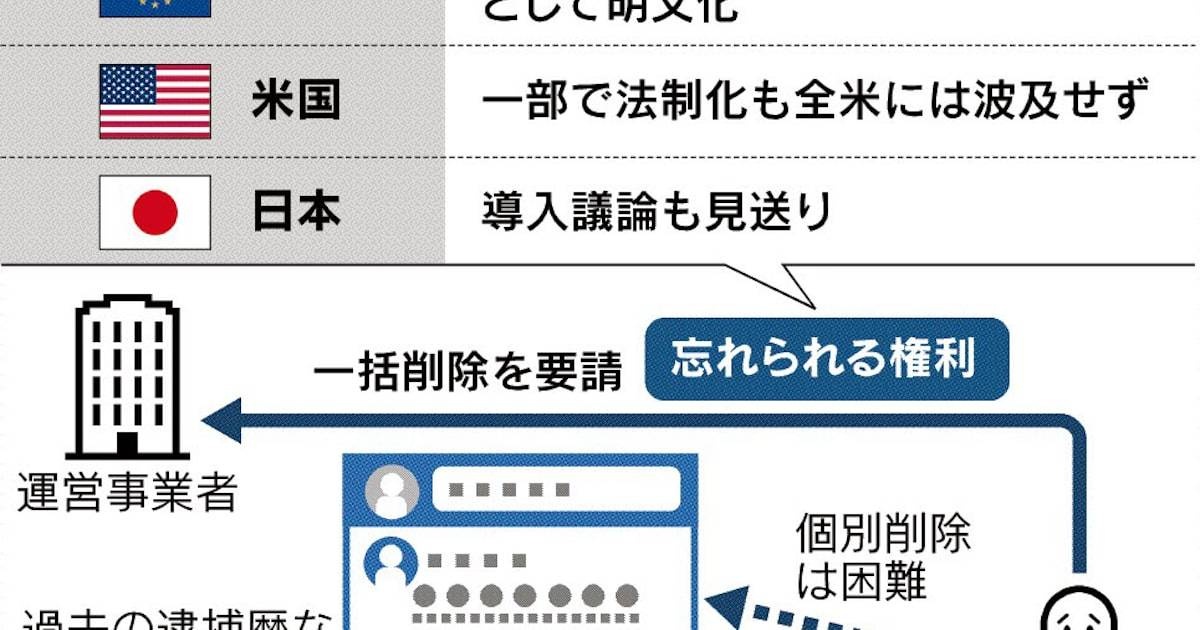 「忘れられる権利」欧州先行 米は慎重、日本は明文規定設けず - 日本経済新聞プライバシー保護の新しい権利として近年、世界的に議論となってきたのが「忘れられる権利」だ。欧州連合(EU)の最高裁にあたる欧州司法裁判所は2014年、忘れられる権利を初めて認め、グーグルに検索結果の削除を命じた。その流れを受け、EUの個人情報保護のルール「一般データ保護規則」(GDPR)が権利を明文化。インターネット企...www.nikkei.com