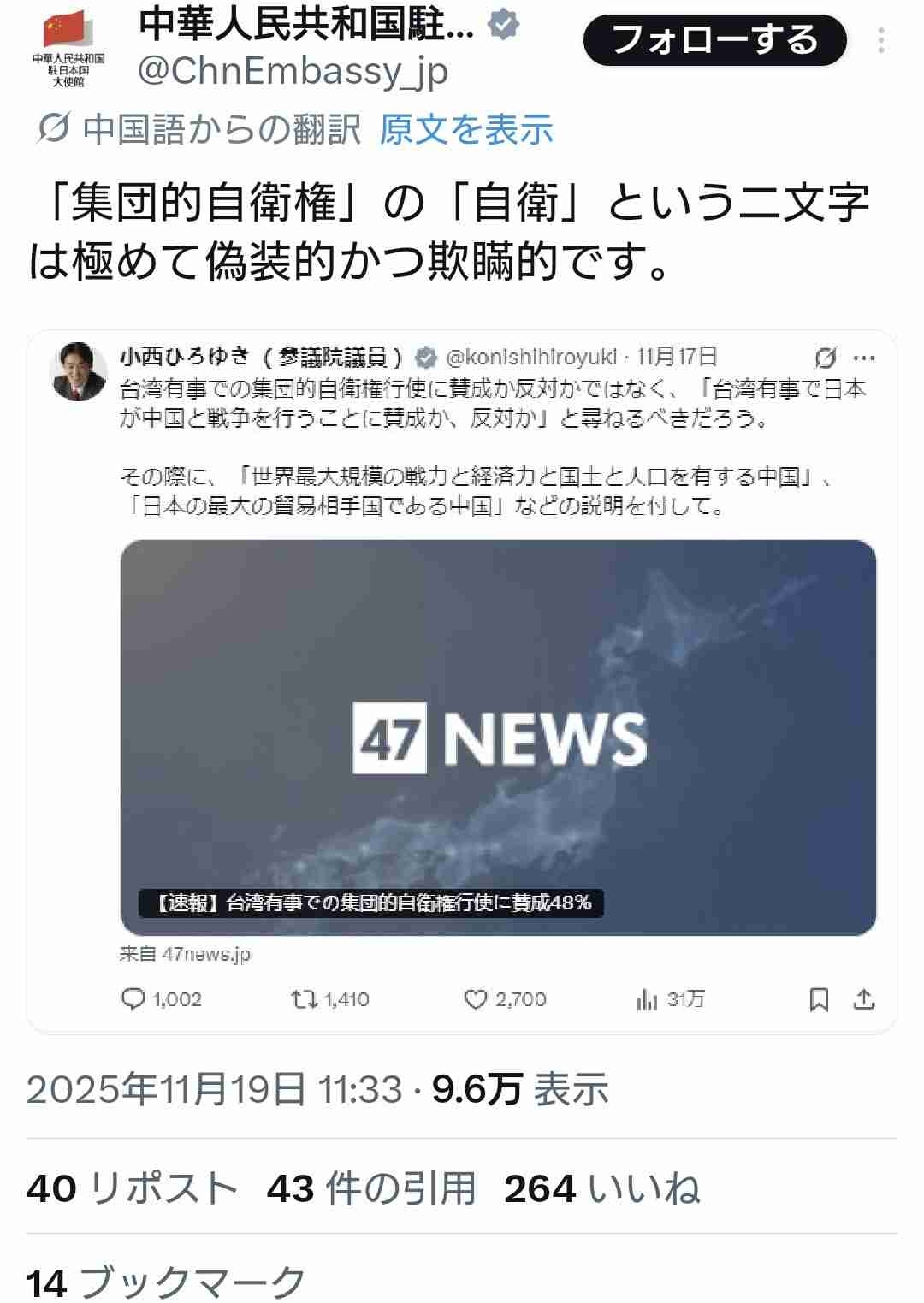 中華人民共和国の日本大使館が小西のこのツィートを取り上げてるんでしょ?