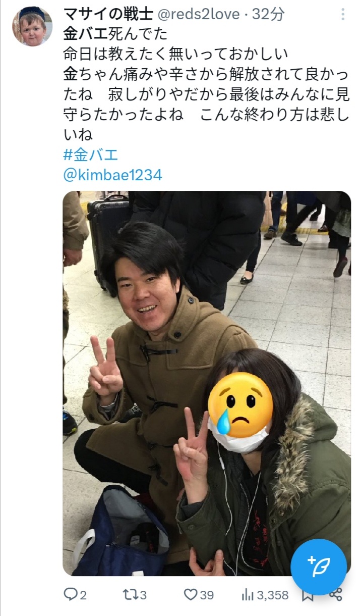 23日朝、三杯目ひかるは実施したツイキャス配信の中で、金バエさんの世話をしている女性「真央」から同日午前9時頃に電話があったと報告。そこで金バエさんが亡くなっていたことを知らされたと明かしました。電話の内容について初めは口を開かなかったひかるですが、視聴者の求めに応じて「金バエさんが亡くなっているという話でした」と告白しました。続けて、「いつ頃なのかは言えないみたいな感じだったんですね。ただ、5月ではないと言っていました」「葬儀は終えているみたい」と報告しました。