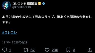 嫌儲コレコレ「本日23時の生放送にて元ホ口ライブ、湊あ<あ関連の告発をします。」