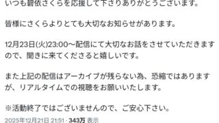 嫌儲vtuber碧依さくら、大切なお知らせ 23日23時~ アーカイブは残らない模様