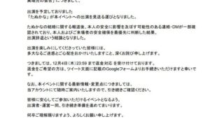 なんGたぬかなさん、身の安全が確保されない為にイベント出演自粛へ