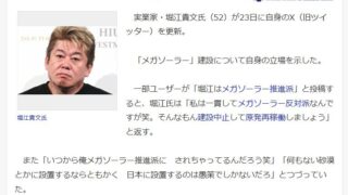 嫌儲ホリエモン「一貫してメガソーラー反対派なんですが笑。そんなもん建設中止して原発再稼働しましょう」