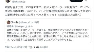 嫌儲ホリエモン「私はメガソーラー大反対派で原発全部再稼働派です。針葉樹林は伐採して広葉樹林中心の里山に戻すべき、北海道は除く