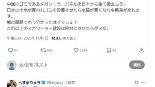 嫌儲へずまりゅう「中国のゴミであるメガソーラーパネルを日本から全て撤去しろ。熊はゴミを設置したせいで生態系が崩れたのが原因
