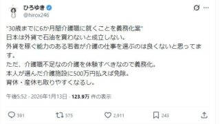 嫌儲ひろゆき「30歳までに6か月間介護職に就くことを義務化案、本人が選んだ介護施設に500万円払えば免除」