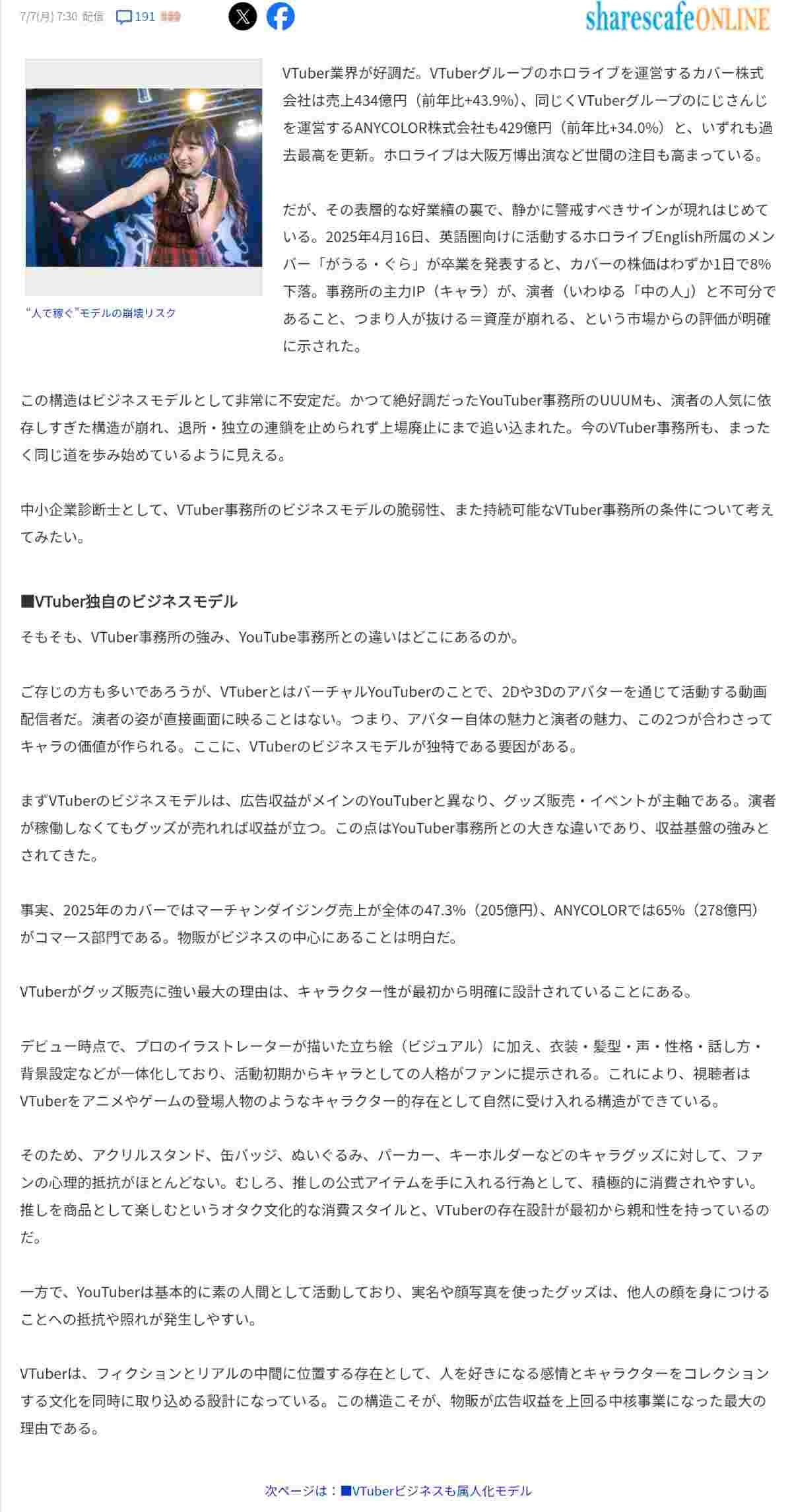 〉VTuberビジネスにおける最も大きな構造変化は、独立しても人気が出る、という前例が、すでに成立してしまったことだ。これは、業界にとって決定的な転換点である。