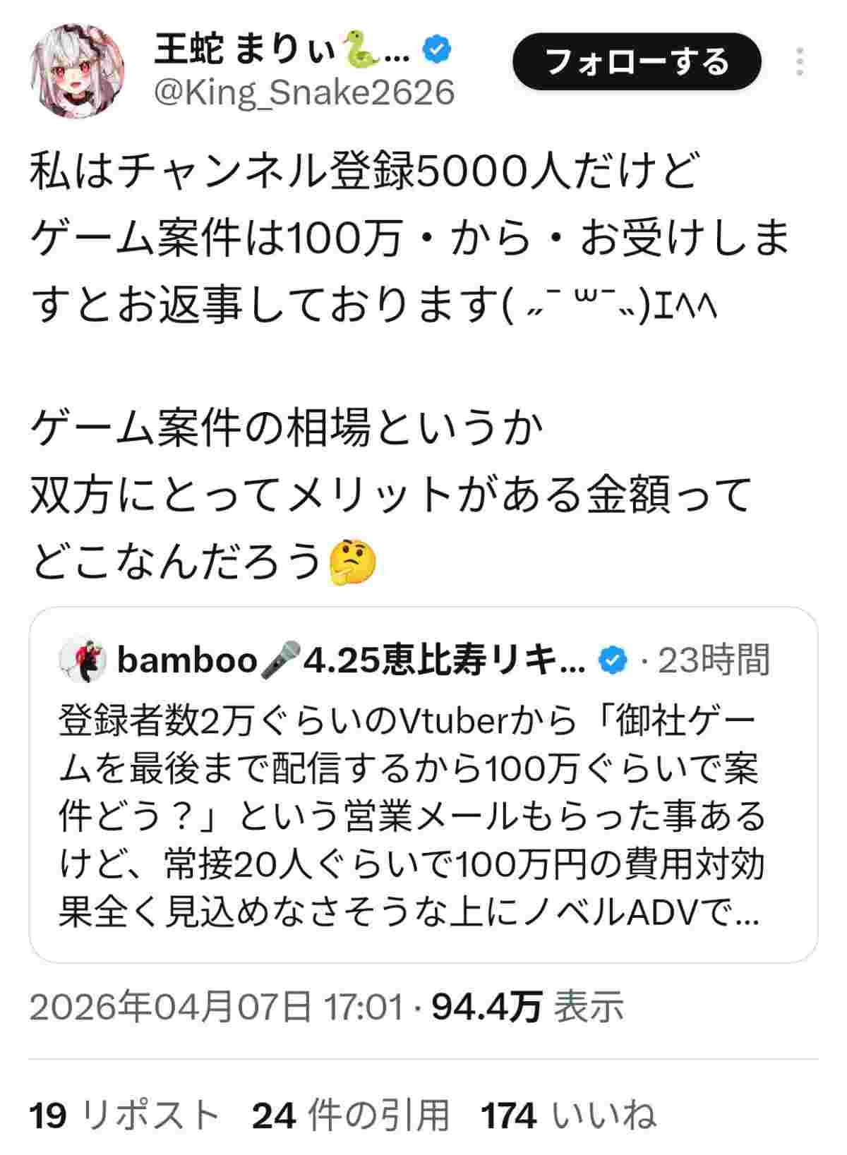 VTuberさん、「案件は100万から受けます、何故なら正当にVに還元されないから。Vを経由しないと売れないのにおかしい」と長文を投稿