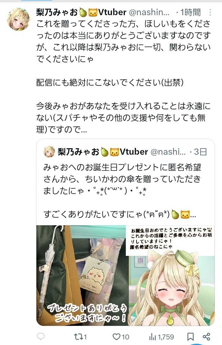これを贈ってくださった方、ほしいもをくださったのは本当にありがとうございますなのですが、これ以降は梨乃みゃおに一切、関わらないでくださいにゃ