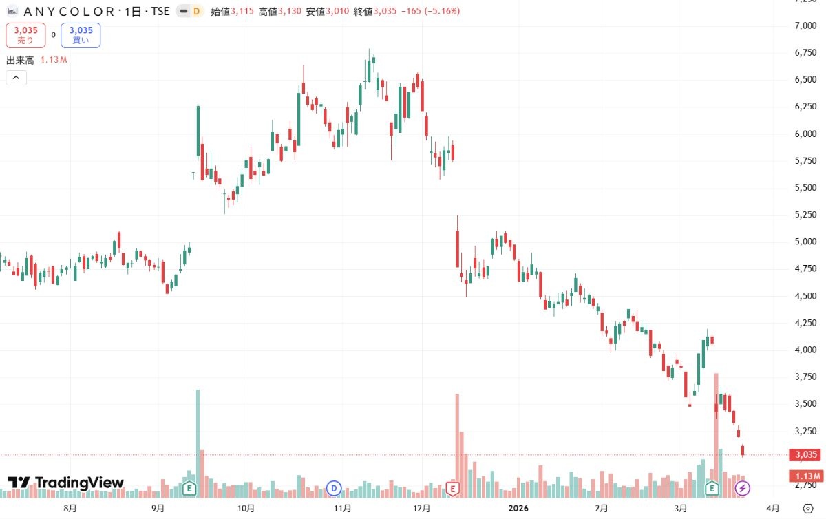 そうであるのにもかかわらず、エニーカラーの株価は、2025年11月の高値6790円から2026年3月23日時点の終値で3035円と、わずか4カ月で半値に沈んだ。